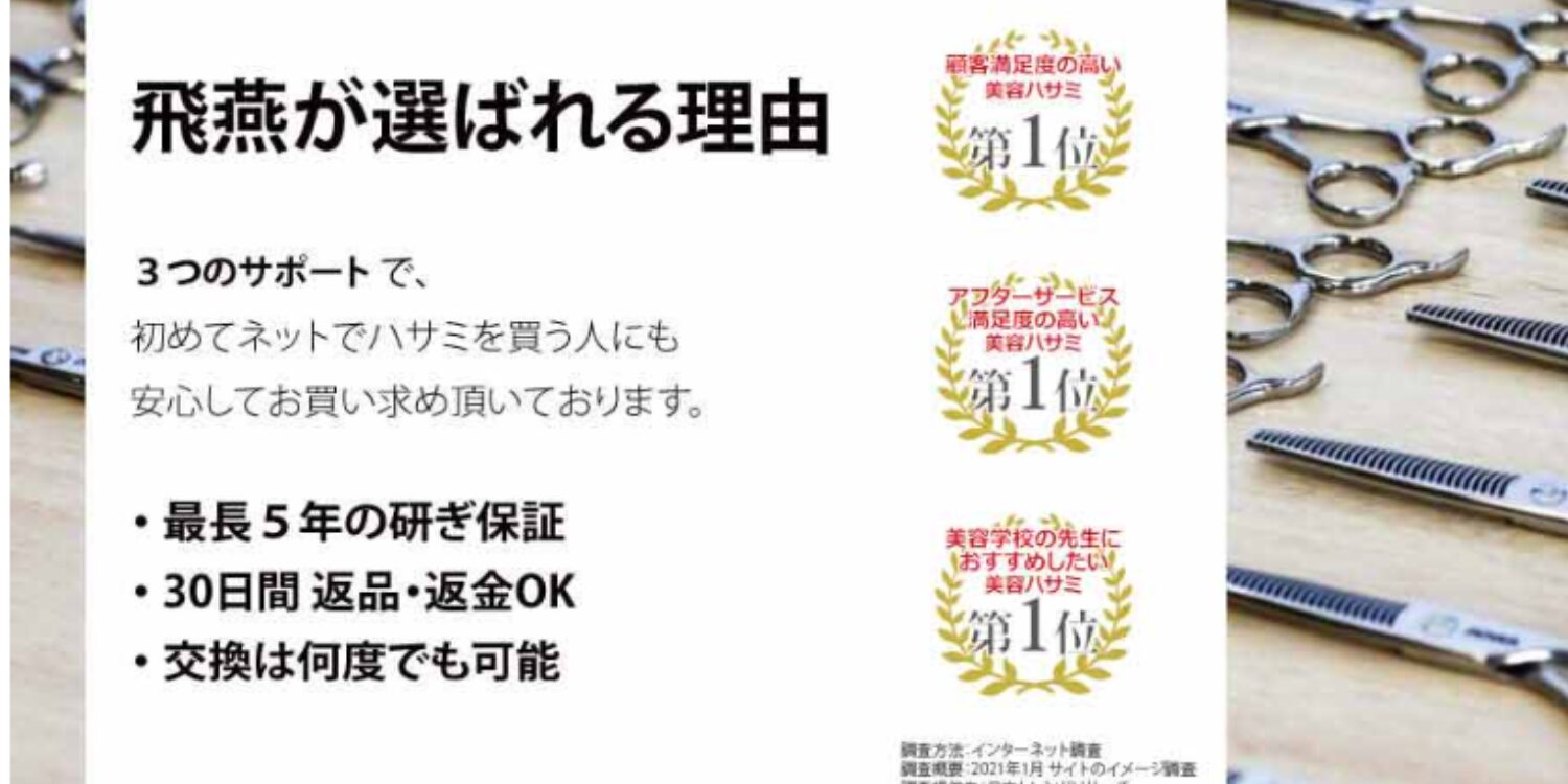 シザーは一度購入すると長く使用するものでもあるため、実際に自分に合うかどうか、購入後のサポートがあるかどうかが気になるところです。飛燕シザーは、こうした不安を解消するため、業界トップレベルの保証と、多様なニーズに応える豊富なラインナップで応えています。業界トップレベルの充実した保証とアフターサービス